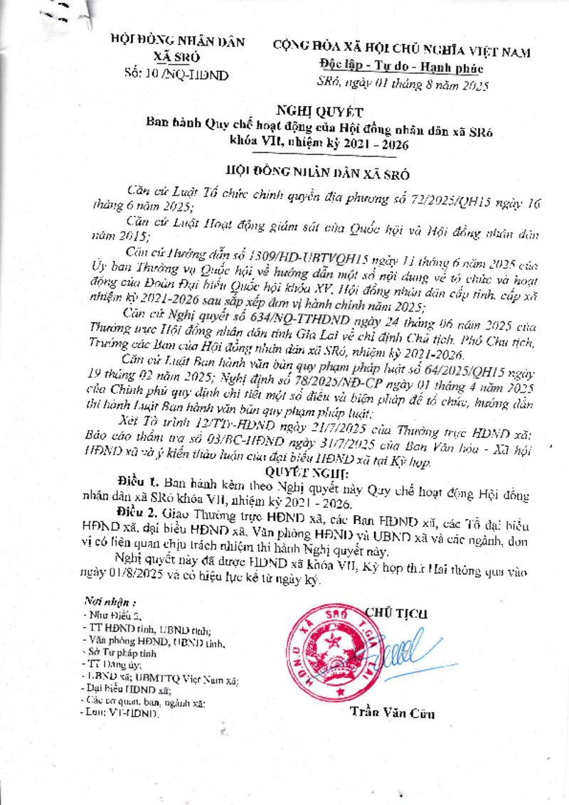 NGHỊ QUYẾT BAN HÀNH QUY CHẾ HOẠT ĐỘNG CỦA HĐND XÃ SRÓ 26/08/2025, 15:55:40 - Lượt xem: 3 Tweet Thêm vào danh sách Báo xấu Thông tin tài liệu NGHỊ QUYẾT BAN HÀNH QUY CHẾ HOẠT ĐỘNG CỦA HĐND XÃ SRÓ