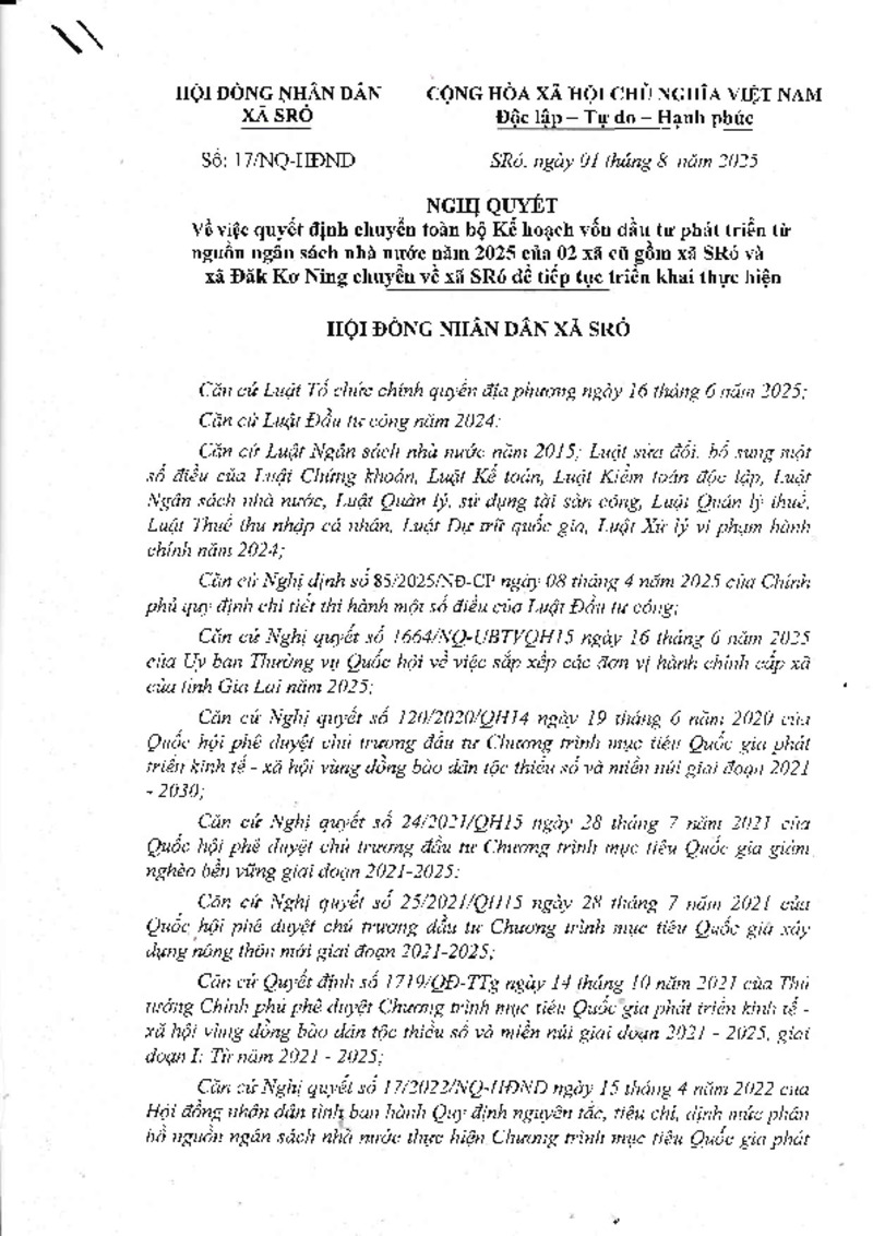 NGHỊ QUYẾT VỀ VIỆC CHUYỂN TOÀN BỘ KẾ HOẠCH VỐN ĐẦU TƯ PHÁT TRIỂN TỪ NGUỒN NGÂN SÁCH NHÀ NƯỚC NĂM 2025 CỦA 02 XÃ CỮ GỒM XÃ SRÓ VÀ XÃ ĐĂK KƠ NING CHUYỂN VỀ XÃ SRÓ ĐỂ TIẾP TỤC TRIỂN KHAI THỰC HIỆN