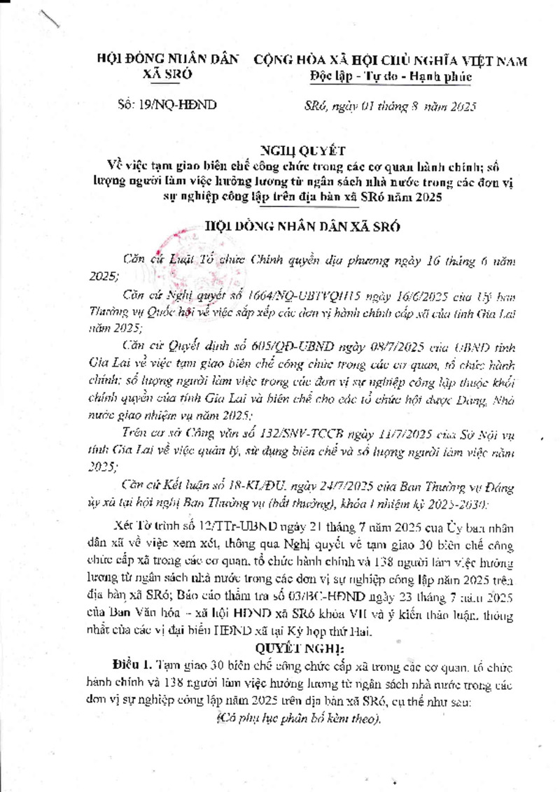 NGHỊ QUYẾT VỀ VIỆC TẠM GAO BIÊN CHẾ CÔNG CHỨC TRONG CÁC CƠ QUAN HÀNH CHÍNH; SỐ LƯỢNG NGƯỜI LÀM VIỆC HƯỞNG LƯƠNG TỪ NGÂN SÁCH NHÀ NƯỚC TRONG CÁC ĐƠN VỊ SỰ NGHIỆP CÔNG LẬP TRÊN ĐỊA BÀN XÃ SRÓ NĂM 2025