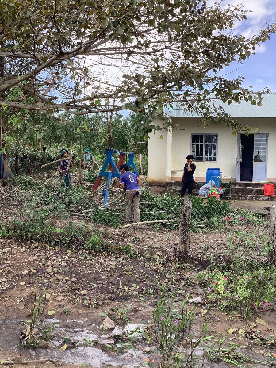 Tổ chức lực lượng, cùng bà con nhân dân đóng lại mái Tole ở các điểm trường, vệ sinh sạch sẽ các phòng học để kịp thời cho công tác dạy và học vào ngày 10/11/2025.
