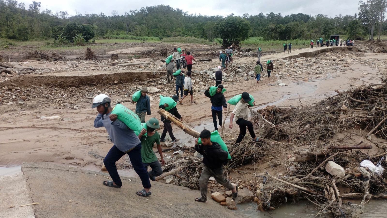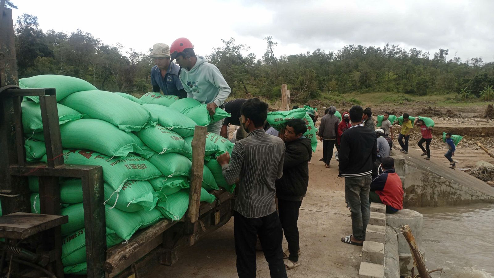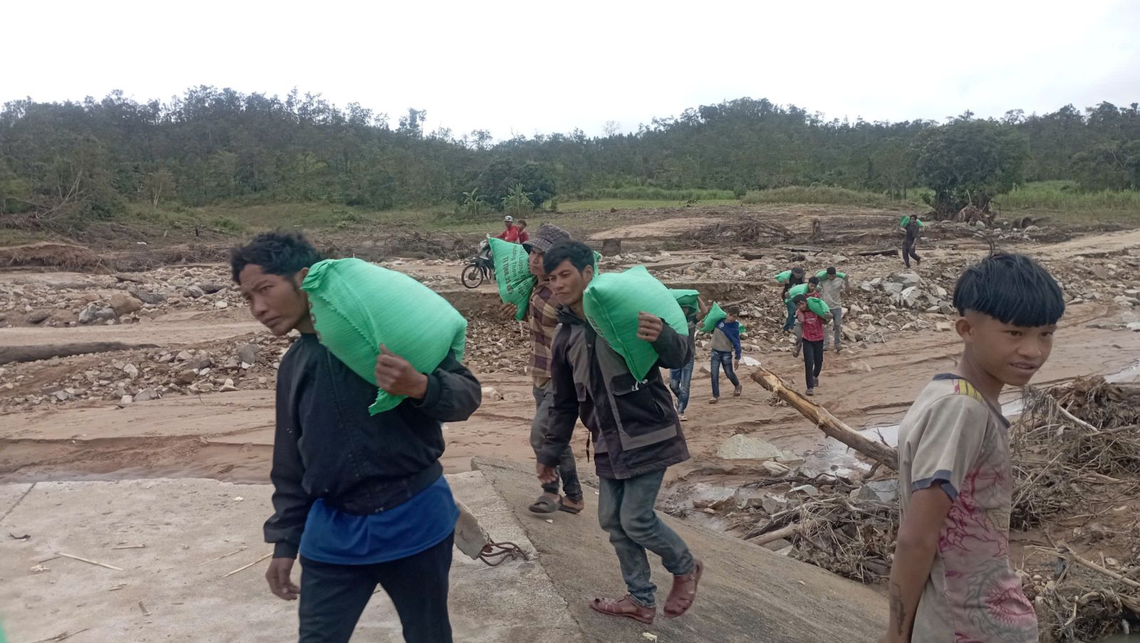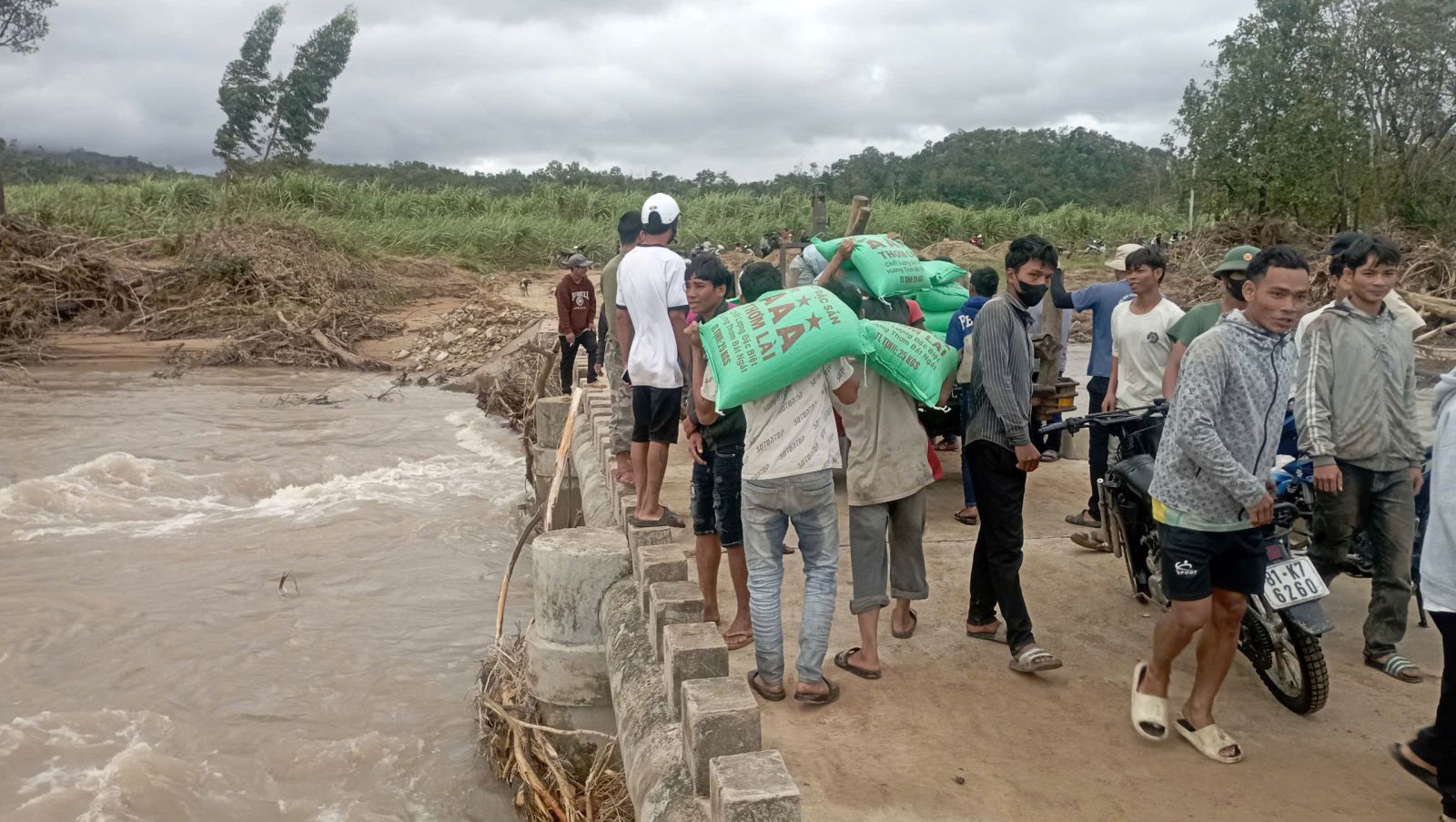 Phòng Văn hóa -Xã hội đã phải huy động bà con tải gạo qua đoạn lở để tập kết tại nhà rông làng H'rach và cấp cho bà con kịp thời.