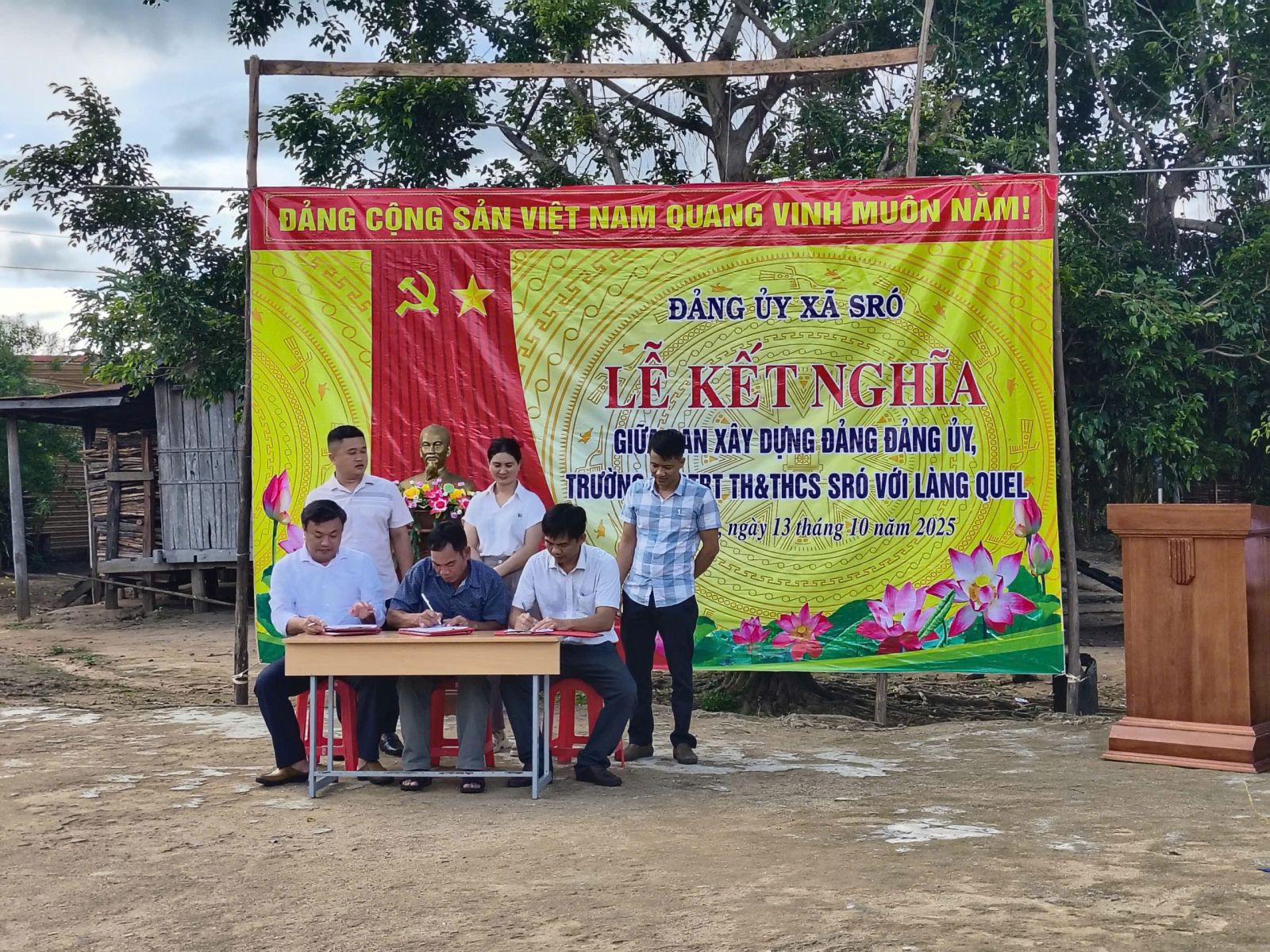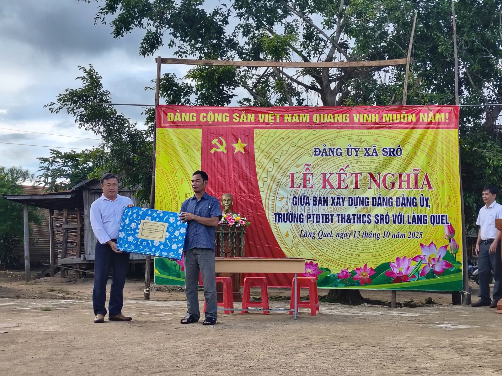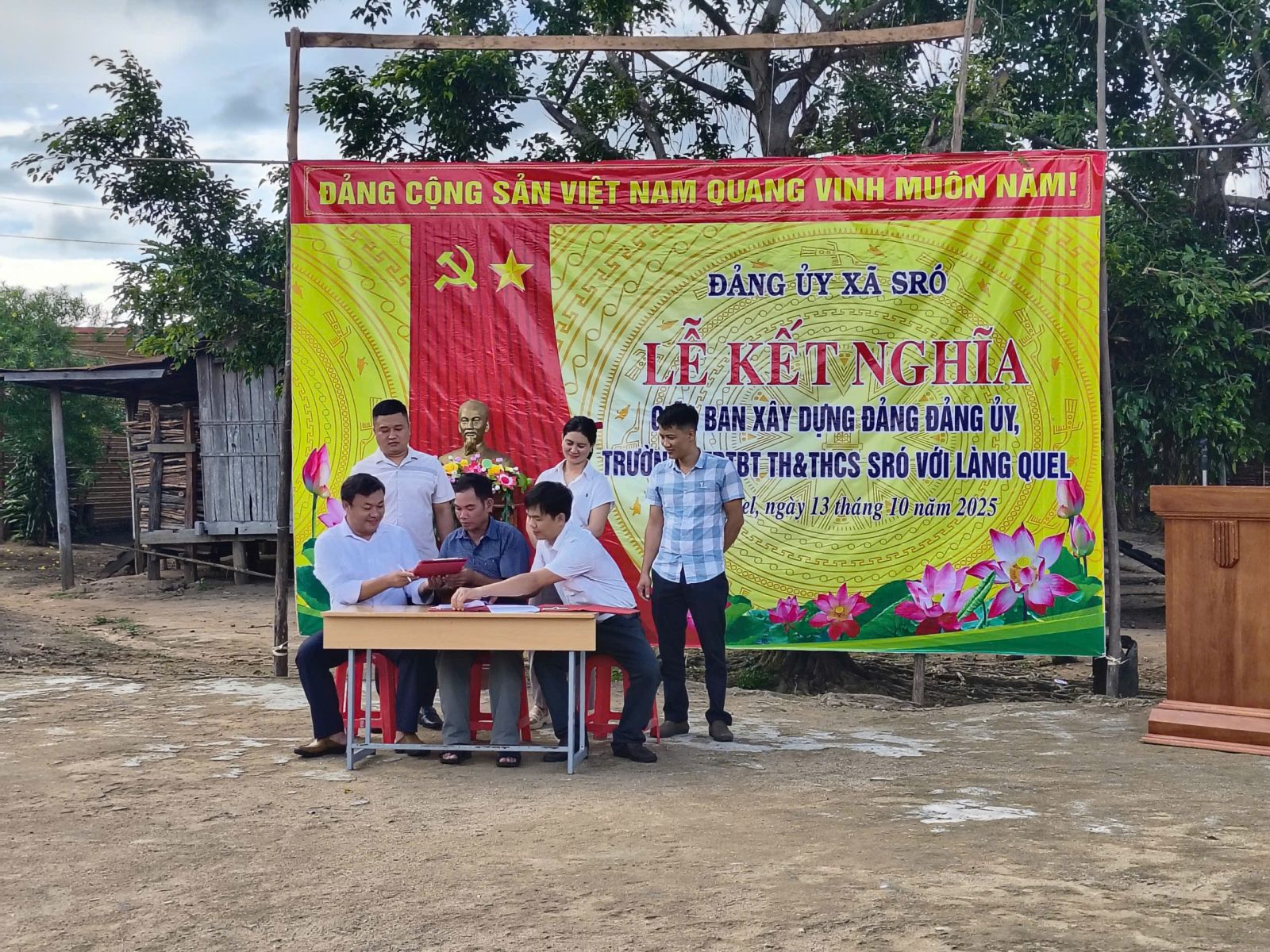 Thực hiện Chỉ thị số 03-CT/TU ngày 07 tháng 8 năm 2025 của Ban Thường vụ Tỉnh ủy về tăng cường hoạt động kết nghĩa giữa các địa phương, đơn vị với các thôn, làng vùng đồng bào dân tộc thiểu số trên địa bàn tỉnh; Kế hoạch số 21-KH/ĐU ngày 22 tháng 9 năm 2025 của Ban Thường vụ Đảng ủy. Ngày 13/10/2025, Ban Xây dựng Đảng Đảng ủy xã, Trường PTDTBT Tiểu học và THCS SRó đã phối hợp tổ chức Lễ kết nghĩa với làng Quel, xã SRó Buổi lễ diễn ra trong không khí trang trọng, ấm áp tình đoàn kết. Tại buổi lễ, đại diện các bên đã ký Giao ước kết nghĩa, thống nhất cùng phối hợp thực hiện các hoạt động thiết thực như: Hỗ trợ, giúp đỡ làng tập trung phát triển kinh tế - xã hội, nâng cao đời sống nhân dân làng; vận động nhân dân làng tích cực lao động sản xuất, phát triển kinh tế gia đình, tham gia các phong trào thi đua yêu nước, xây dựng nông thôn mới; giữ vững an ninh chính trị, trật tự an toàn xã hội; phối hợp chặt chẽ với cơ quan kết nghĩa kịp thời thông tin tình hình, những khó khăn, vướng mắc, nguyện vọng của làng đến cơ quan kết nghĩa.để có giải pháp phù hợp. Nhằm chia sẻ, động viên tinh thần bà con, các đơn vị đã tặng quà cho tập thể làng Quel và 5 hộ dân có hoàn cảnh khó khăn trên địa bàn. Đây là hoạt động ý nghĩa, thể hiện sự quan tâm, trách nhiệm và tinh thần tương thân tương ái, góp phần thắt chặt hơn nữa tình đoàn kết giữa cơ quan, đơn vị với nhân dân địa phương. Phát biểu tại buổi lễ, đại diện các đơn vị khẳng định: việc kết nghĩa không chỉ là hoạt động mang ý nghĩa chính trị - xã hội sâu sắc mà còn góp phần củng cố khối đại đoàn kết toàn dân tộc, tạo điều kiện để các cơ quan, đơn vị và người dân cùng hỗ trợ, giúp nhau phát triển kinh tế - xã hội, xây dựng địa phương ngày càng giàu đẹp. Kết thúc buổi lễ, các đơn vị và bà con làng Quel cùng tham gia giao lưu thể thao, văn hóa, văn nghệ, thể hiện tinh thần đoàn kết, gắn bó và quyết tâm thực hiện tốt các nội dung đã ký.