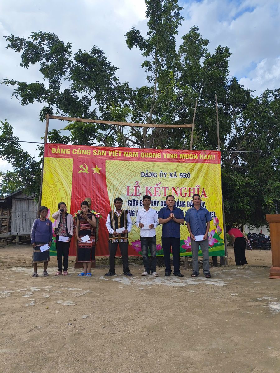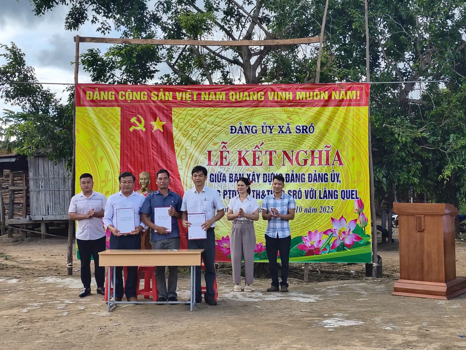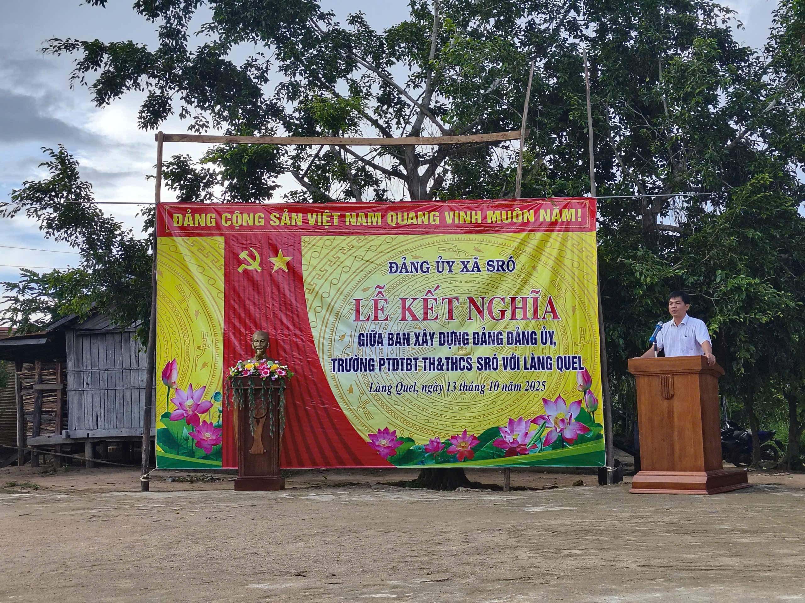 Thực hiện Chỉ thị số 03-CT/TU ngày 07 tháng 8 năm 2025 của Ban Thường vụ Tỉnh ủy về tăng cường hoạt động kết nghĩa giữa các địa phương, đơn vị với các thôn, làng vùng đồng bào dân tộc thiểu số trên địa bàn tỉnh; Kế hoạch số 21-KH/ĐU ngày 22 tháng 9 năm 2025 của Ban Thường vụ Đảng ủy. Ngày 13/10/2025, Ban Xây dựng Đảng Đảng ủy xã, Trường PTDTBT Tiểu học và THCS SRó đã phối hợp tổ chức Lễ kết nghĩa với làng Quel, xã SRó Buổi lễ diễn ra trong không khí trang trọng, ấm áp tình đoàn kết. Tại buổi lễ, đại diện các bên đã ký Giao ước kết nghĩa, thống nhất cùng phối hợp thực hiện các hoạt động thiết thực như: Hỗ trợ, giúp đỡ làng tập trung phát triển kinh tế - xã hội, nâng cao đời sống nhân dân làng; vận động nhân dân làng tích cực lao động sản xuất, phát triển kinh tế gia đình, tham gia các phong trào thi đua yêu nước, xây dựng nông thôn mới; giữ vững an ninh chính trị, trật tự an toàn xã hội; phối hợp chặt chẽ với cơ quan kết nghĩa kịp thời thông tin tình hình, những khó khăn, vướng mắc, nguyện vọng của làng đến cơ quan kết nghĩa.để có giải pháp phù hợp. Nhằm chia sẻ, động viên tinh thần bà con, các đơn vị đã tặng quà cho tập thể làng Quel và 5 hộ dân có hoàn cảnh khó khăn trên địa bàn. Đây là hoạt động ý nghĩa, thể hiện sự quan tâm, trách nhiệm và tinh thần tương thân tương ái, góp phần thắt chặt hơn nữa tình đoàn kết giữa cơ quan, đơn vị với nhân dân địa phương. Phát biểu tại buổi lễ, đại diện các đơn vị khẳng định: việc kết nghĩa không chỉ là hoạt động mang ý nghĩa chính trị - xã hội sâu sắc mà còn góp phần củng cố khối đại đoàn kết toàn dân tộc, tạo điều kiện để các cơ quan, đơn vị và người dân cùng hỗ trợ, giúp nhau phát triển kinh tế - xã hội, xây dựng địa phương ngày càng giàu đẹp. Kết thúc buổi lễ, các đơn vị và bà con làng Quel cùng tham gia giao lưu thể thao, văn hóa, văn nghệ, thể hiện tinh thần đoàn kết, gắn bó và quyết tâm thực hiện tốt các nội dung đã ký.